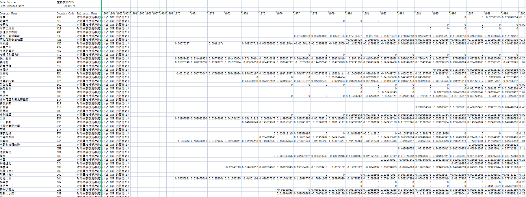 | 阿鲁巴 | ABW | 外国直接投资净流入(BoP,现价美元) | 18882681.56 | -10614525.14 | 186759776.5 |