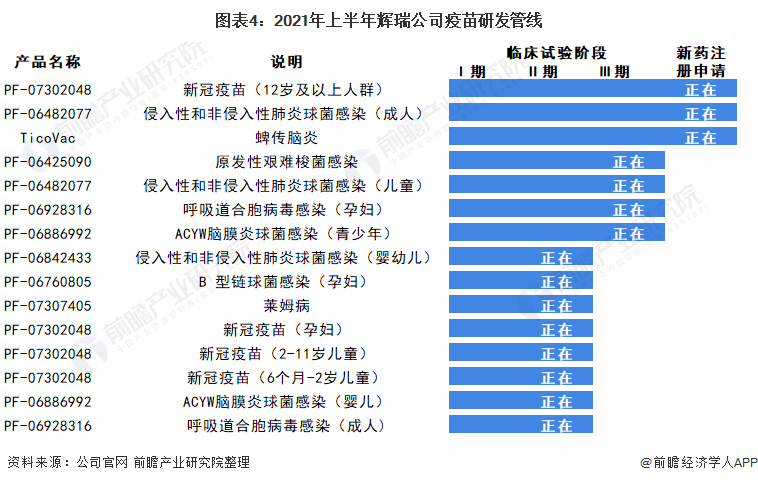 从研发管线上产品类型来看,目前15款产品中有4款是新冠系列疫苗,3款肺炎系列疫苗,2款呼吸道相关疫苗和2款脑膜炎系列疫苗。因此,辉瑞在巩固自身在新冠疫苗上的优势的同时,也注重呼吸系统相关疾病疫苗的研发,以稳固自身凭借13价肺炎疫苗,在肺炎疫苗市场取得的主导地位。