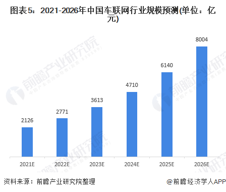 未来几年我国仍然是全球汽车消费大国,随着智能交通的发展,我国车联网用户的规模也将逐年提升,行业渗透率将进入进入加速增长阶段。经过初步估算,车联网市场规模有望在2026年达到8千亿元,2021-2026年平均复合增长率将达到30.36%
