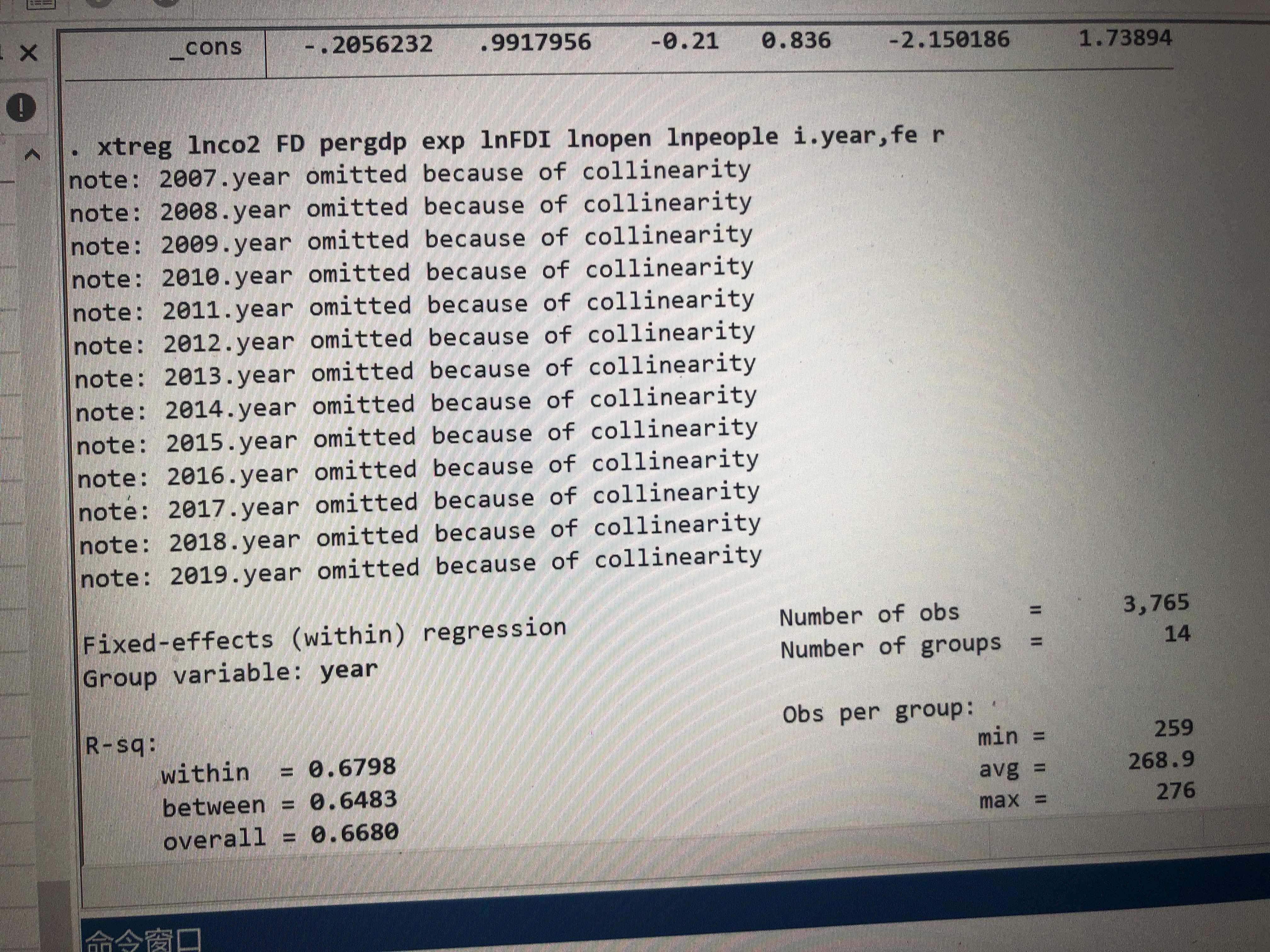 提供思路供参考:双向xtreg代码是不是本身就控制了地区和year两个fixed effect?(这个代码我用的不多不确定你可以查下),如果是这样,你再手动打了i.year可能就会出现如图的bug。还有一种需要手动敲i.year的是reg y x i.province i.year,是不是把两种做法混淆了?