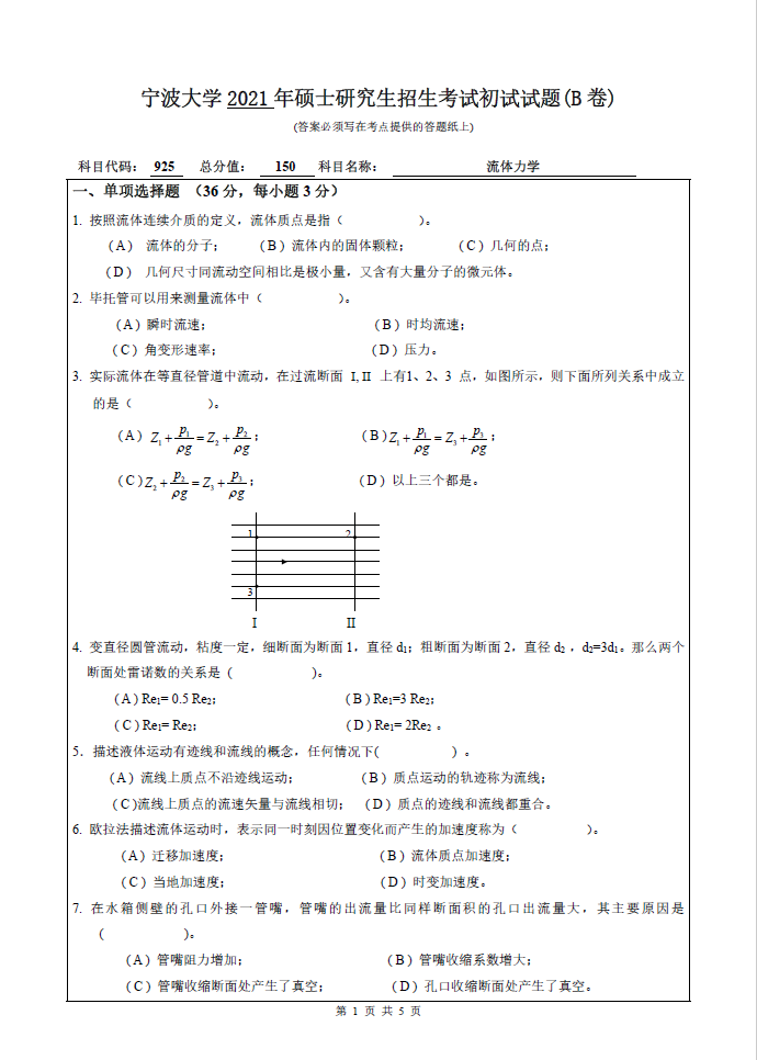 925流体力学(宁波大学2021年硕士研究生招生考试初试试题).pdf
