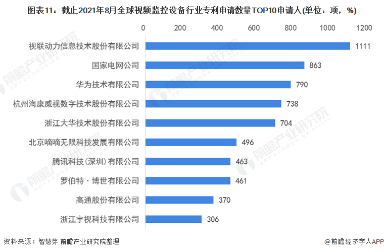 其中,视联动力信息技术股份有限公司视频监控设备专利申请数量最多,为1111项。国家电网公司排名第二,其视频监控设备专利申请数量为863项。