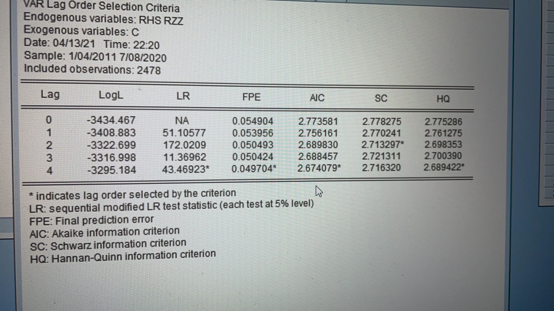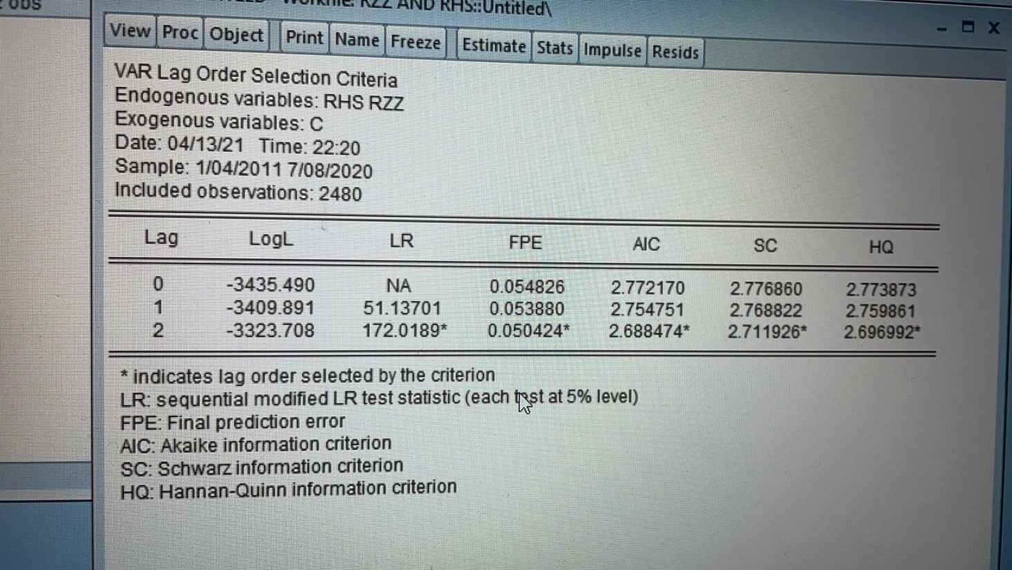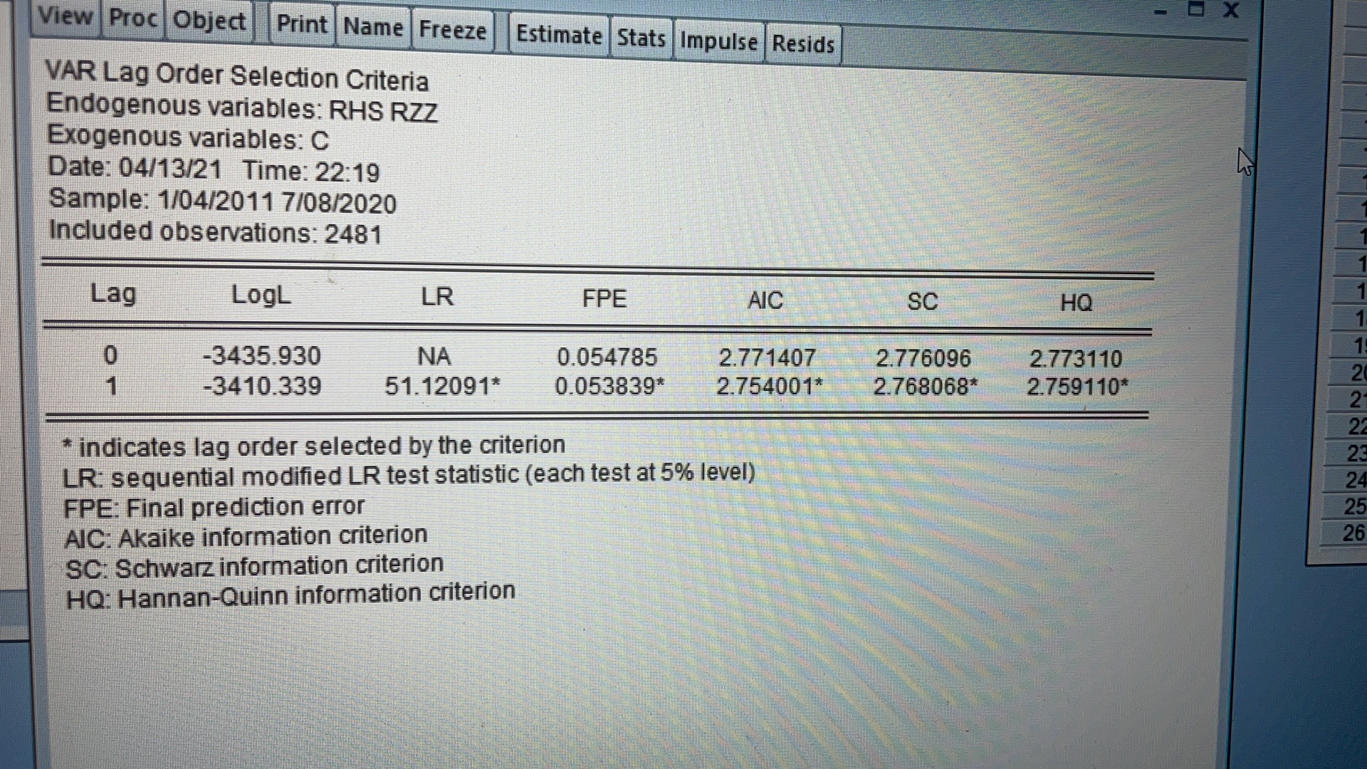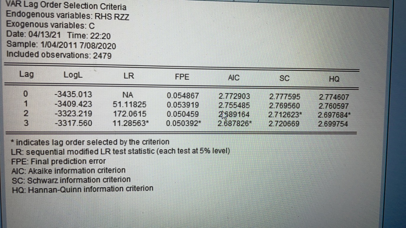 xieyu75 发表于 2021-12-6 09:53 不知道你的样本数有多大,我会选择1-2阶,VAR滞后多了之后待估参数太多。 另外,是不是平稳序列?
