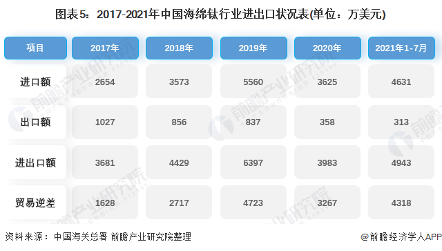 随着国内钛加工企业海绵钛需求的爆发式增长,2017-2020年,我国海绵钛出口额大幅下降,2017年达到近年来最高为1027万美元,到2020年出口金额降至358万美元,同比下降57.23%。2021年1-7月海绵钛累计出口额达313万美元。