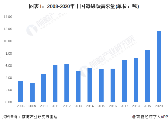 2017年以后,在高端化工、航空航天、船舶和电力等行业需求带动下,我国钛加工材需求创历史新高,也带动海绵钛的需求创历史新高,钛合金原料的90%使用海绵钛,每加工1吨钛材约需消耗海绵钛1.25吨,按照这一比重,结合钛材产量进行计算,2020年我国海绵钛需求量达11.7万吨。