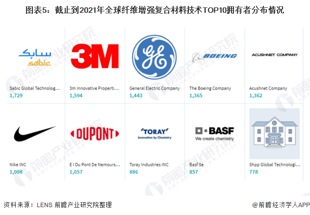 根据LENS的数据显示,截止到2021年9月3日,Sabic Global Technology Bv公司拥有的专利数最多,达到了1729件;其次是3M公司,达到了1594件。由此可见,海外国家的纤维增强复合材料单个企业在技术上面远远领先。