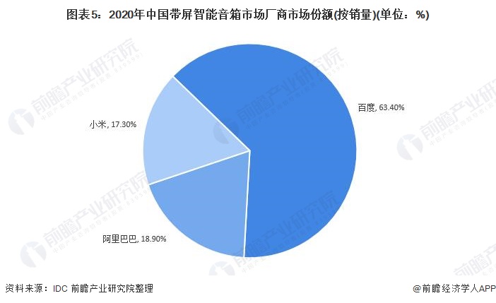 从市场份额来看,中国智能音箱市场基本形成了百度、阿里巴巴、小米三足鼎立的市场竞争格局。在2020年中国智能音箱市场上,阿里巴巴、百度和小米的销量共占市场份额的95.56%,其中阿里巴巴销量位居第一,大致为1285万台,市场份额近35%;百度和小米分别以1228万台和1000万台左右的销量位列二、三,市场份额分别为33.4%和27.2%。