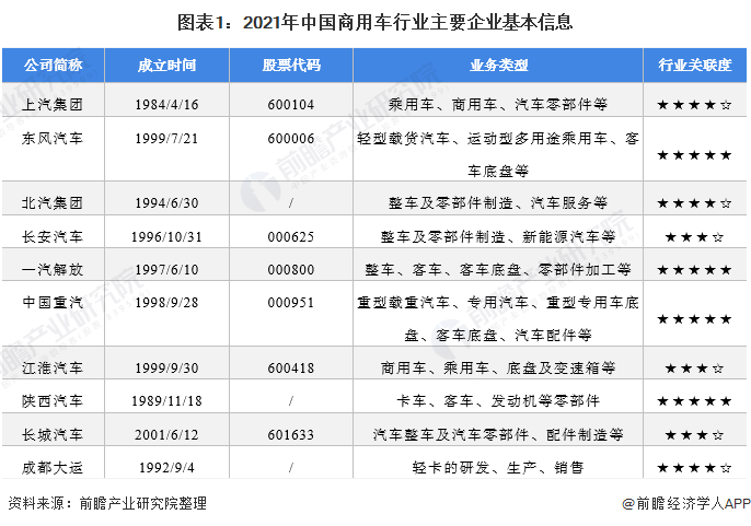 商用车属于重资产行业,生产企业数量分布广,市场竞争充分。商用车制造企业主营业务主要涵盖商用车整车制造、商用车配套零部件生产销售、新能源商用车生产及销售等。商用车整车生产销售企业主要包含上汽、东风、北汽、长安、一汽等。