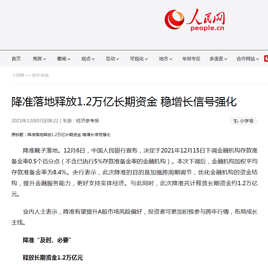 人民网文章发布了,央行宣布于2021年12月15号全面下调金融机构存款准备金率0.5个百分点,本次下调后,金融机构加权平均存款准备金率为8.4%。这个存款准备金率,大家可以简单理解为