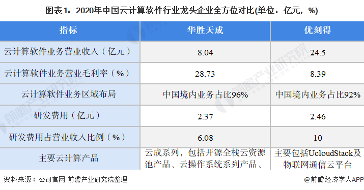 目前我国云计算软件龙头企业包括华胜天成、优刻得、东软集团等。从云计算软件的营收规模来看,优刻得营收规模较高,2020年实现营收规模24.5亿元,但从云计算软件的营业毛利率来看,华胜天成的毛利率达到28.73%。从业务区域布局来看,两家龙头企业均聚焦境内业务;从研发投入及占比来看,两家企业相差不大。2020年华胜天成研发投入金额达2.37亿元,占营业收入6.08%。其他对比如下: