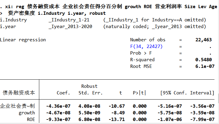 此外债务融资成本要注意单位 或者取对数,因为你的系数太小了