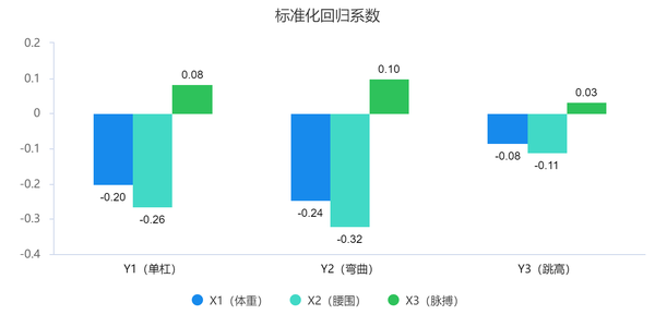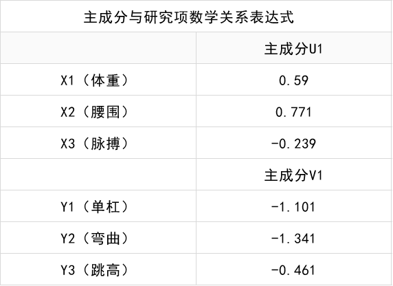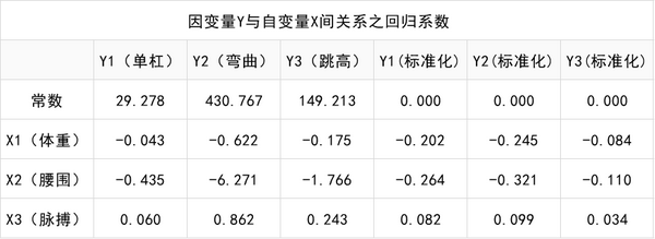Y1(单杠)=-0.202X1(体重)-0.264X2(腰围)+0.082X3(脉搏) Y2(弯曲)=-0.245X1(体重)-0.321X2(腰围)+0.099X3(脉搏) Y3(跳高)=-0.084X1(体重)-0.110X2(腰围)+0.034*X3(脉搏)