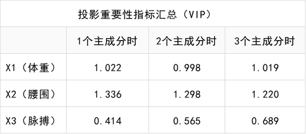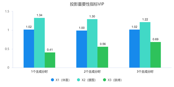 上图表中显示,1个主成分和2个主成分时,3个X对应的VIP指标变化均很小,仅X3有着一定变化(从0.414到0.565),2个主成分到3个主成分时,3个X对应的VIP指标变化也很小。因而说明可能1个主成分或者2个主成分均较为适合,具体还可以结合交叉有效性进行综合决定。