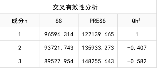 由上表可知,只有当主成分为1时,Qh²值符合判断大于0.0975,第2个或者第3个主成分对于模型没有贡献,因此最终选择1个主成分作为结论。