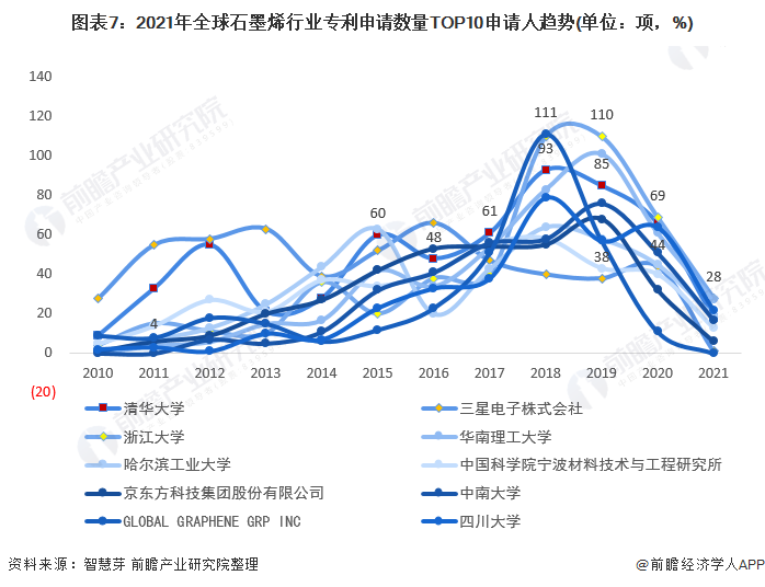 全球石墨烯行业专利申请数量TOP10申请人分别是清华大学、三星电子株式会社、浙江大学、华南理工大学、哈尔滨工业大学、中国科学院宁波材料技术与工程研究所、京东方科技集团股份有限公司、中南大学、GLOBAL GRAPHENE GRP INC和四川大学。