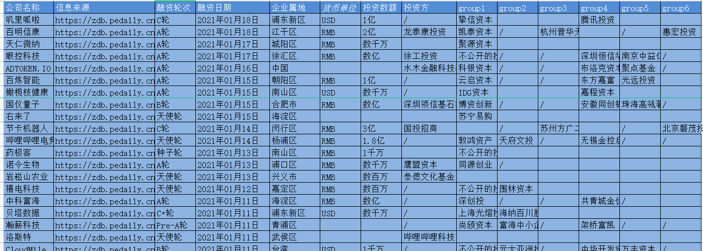 公司名称 信息来源 融资轮次 融资日期 企业属地 货币单位 投资数额 投资方 group1 group2 group3 group4 group5 group6