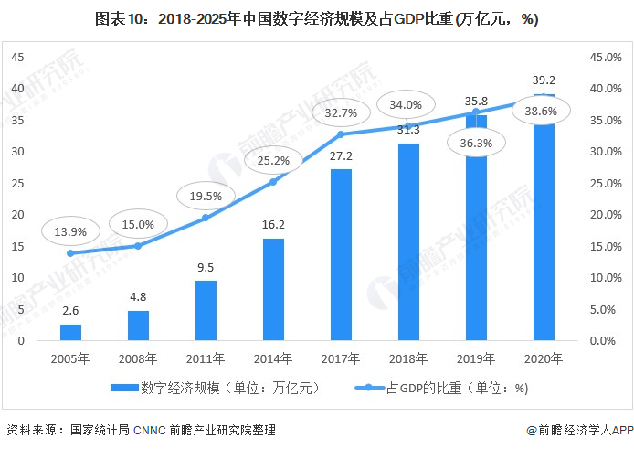 据信通院数据库统计,2020年中国数字经济国模高达39.2万亿元,占GDP比重的38.6%,且份额不断提升。其中数字化核心产业增加值规模为7.9万亿元人民币,未来还将持续增长。