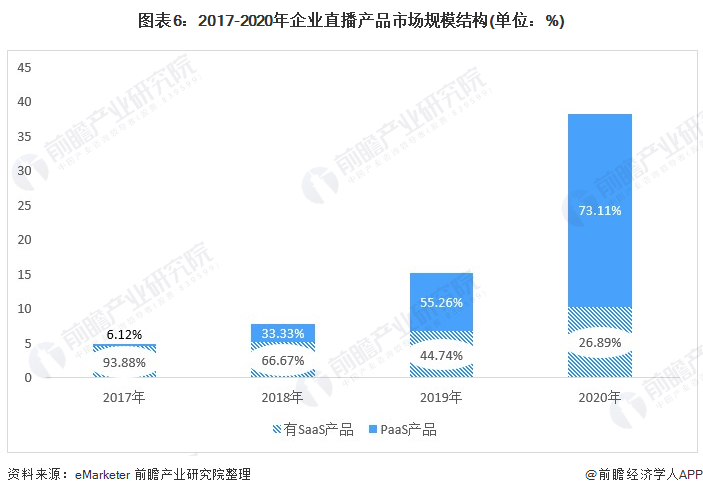 产品结构方面,企业直播市场增量的主要来源有SaaS产品市场增量、PaaS产品市场增量两部分。SaaS平台现阶段的市场规模毛利较小当前占比不到30%。随着企业数字化程度逐步加深,定制化需求下,企业直播PaaS产品份额将持续加深2020年,产品市场规模占据73.11%。