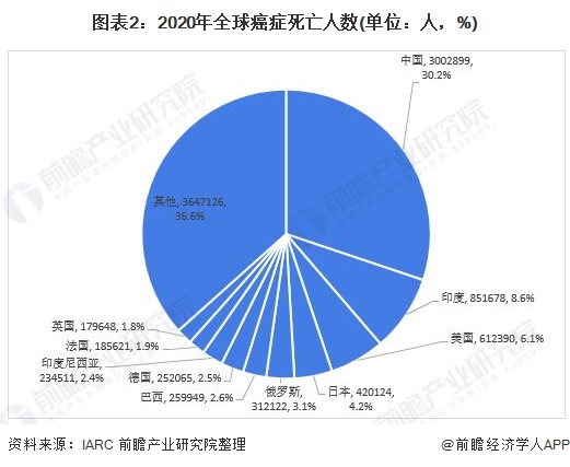 根据IARC数据,2020年中国癌症死亡病例300万例,占全球癌症死亡人数的30.2%,其中男性182万例,女性118万例。