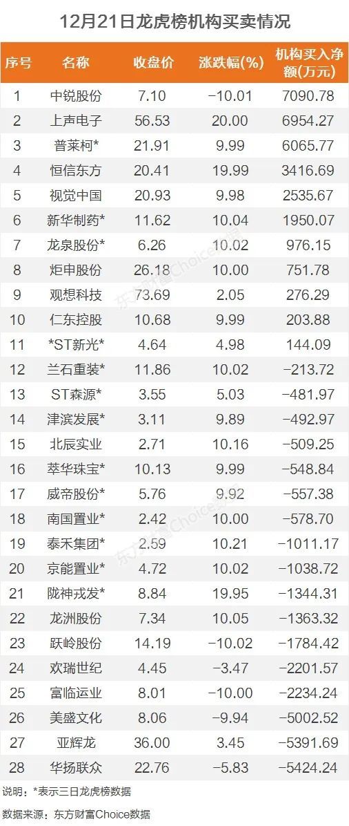 机构参与龙虎榜中个股共涉及28股,其中11股被机构净买入,中锐股份被买入最多,为7090.78万元。另外17股被机构净卖出,华扬联众被卖出最多,为5424.24万元。