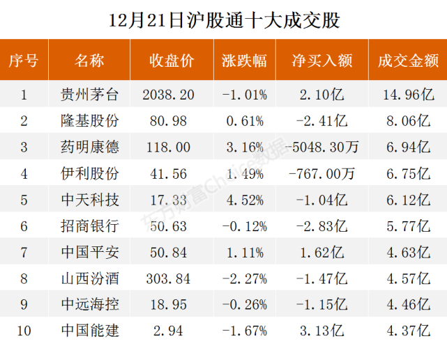 交易所公布的沪深港通十大成交股显示,北上资金大幅净买入中国能建3.13亿元,净买入贵州茅台2.10亿元,净买入中国平安1.62亿元。同时大幅净卖出五粮液6.65亿元,净卖出宁德时代4.83亿元。
