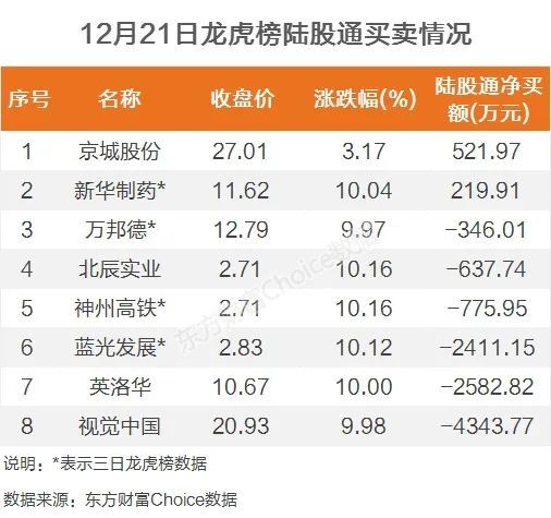 12月21日,北向资金当日成交净买额为-9.97亿元。其中,沪股通当日成交净买额为12.23亿元;深股通当日成交净买额为-22.20亿元。