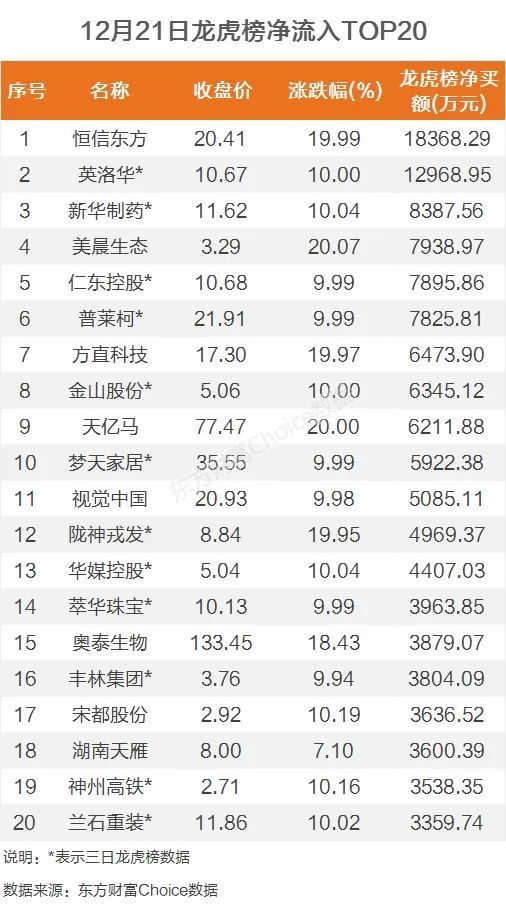 12月21日,上榜龙虎榜个股中,资金净流入最多的是恒信东方,为1.84亿元。数据显示,该股日内涨停收盘,全天换手率35.34%。资金净流入居前的中信北京金融大街净买入4846.03万元。