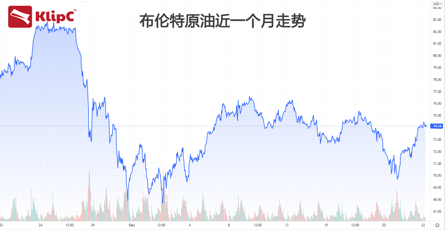 KlipC报道:美东时间周二,布油盘尾上涨3.45%报73.99美元/桶,纽商所2022年2月交货的轻质原油期货上涨3.7%,报71.12美元/桶。