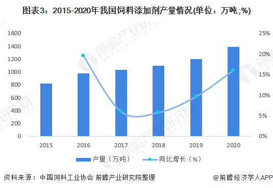 产量方面,我国饲料添加剂产量自2015年以来呈现稳步上升趋势。据中国饲料工业协会统计数据显示,2020年,全国饲料添加剂产量1390.8万吨,同比增长16%。