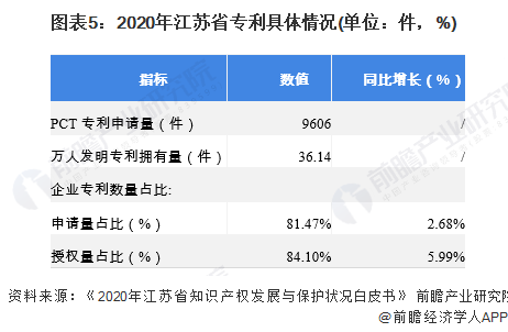 进一步分析2020年江苏省专利情况,2020年江苏省PCT专利申请量9606件,万人发明专利拥有量达36.14件。企业专利申请量、授权量占总量的比重分别达81.47%和84.10%,比2019年底提高了2.13个百分点和4.75个百分点,表明企业作为产学研主体的活跃程度进一步提升,结构进一步优化。