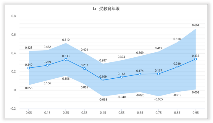 而对于受教育情况,可以看出分位数达到0.25前,影响趋势是呈上升趋势。但提升到一定程度(工资水平为25%分位点)时,教育年限对于工资的影响开始下降,并且截止到工资水平为35%分位数点后,这种影响关系会消失,工资水平不再受到受教育年限的影响。