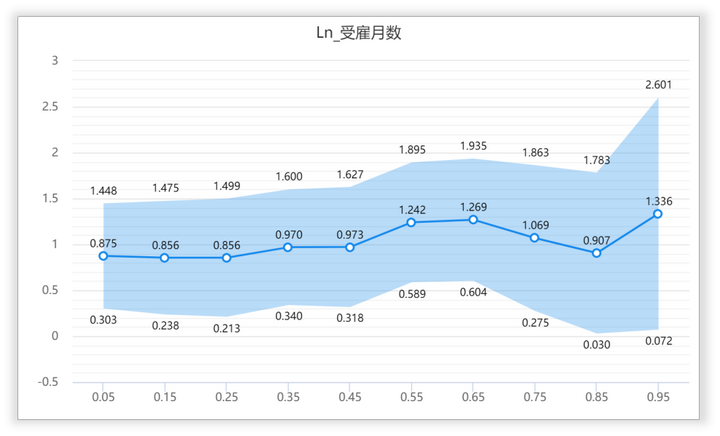 根据上表格结果显示,不同分位数点上,起始工资、受雇月数、受雇佣年限对当前工资的均有着明显的正向影响关系, 与回归分析结果一致。