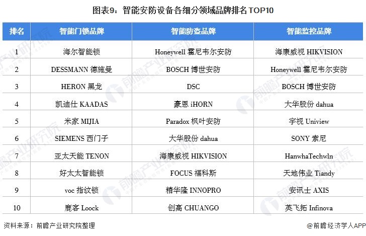 人工智能等发展的促进下,传统安防企业的产品生产逐渐向智能安防领域转变。从当前智能安防设备三个细分领域的十大品牌排名来看,海尔智能锁、Honeywell霍尼韦尔安防和海康威视HIKVISION分别占据了智能门锁、智能防盗和智能监控领域品牌的榜首。在智能防盗报警和智能视频监控两个领域,海康威视HIKVISION、Honeywell霍尼韦尔安防、BOSCH博世安防和大华股份dahua四个品牌均榜上有名。