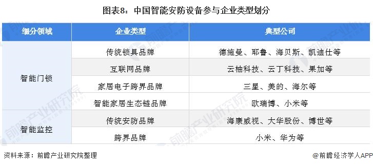 从企业布局情况来看,除了以海康威视、大华股份为代表的传统安防巨头积极推动安防产品智能化转型外,互联网企业、家电企业和3C企业也纷纷布局智能安防市场。