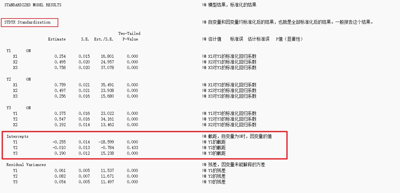 MPLUS输出的标准化回归结果中,为什么仍有截距值?