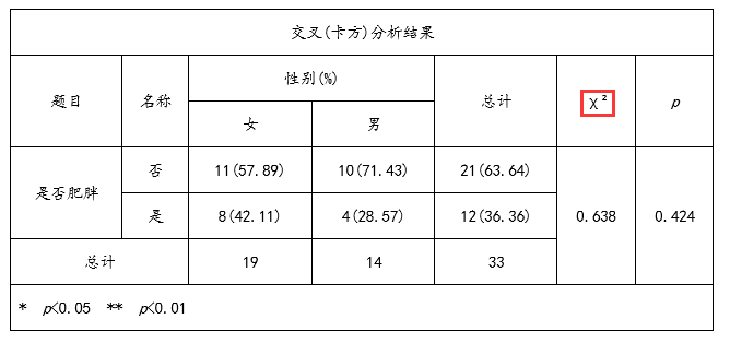 结论:从上表可以看出:不同性别样本对于是否肥胖共1项不会表现出显著性(p>0.05),意味着不同性别样本对于是否肥胖共1项均表现出一致性,并没有差异性。