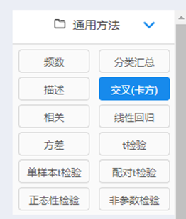 SPSSAU通用方法里面的‘交叉(卡方)’研究方法默认使用Pearson卡方,并且提供百分比按行或者按列两种方式。如下图: