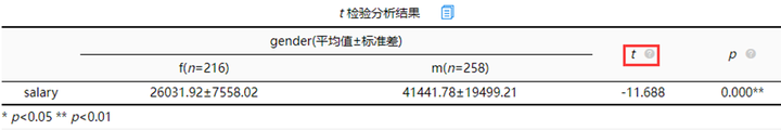 从上表可以看出:不同gender样本对于salary全部均呈现出显著性(p<0.05),意味着不同gender样本对于salary均有着差异性。具体分析可知:gender对于salary呈现出0.01水平显著性(t=-11.688,p=0.000),以及具体对比差异可知, f的平均值(26031.92),会明显低于m的平均值(41441.78)。