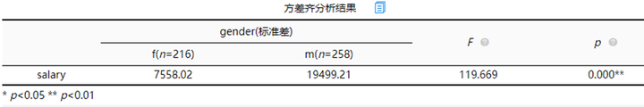 总结可知:不同gender样本对于salary全部均呈现出显著性差异。