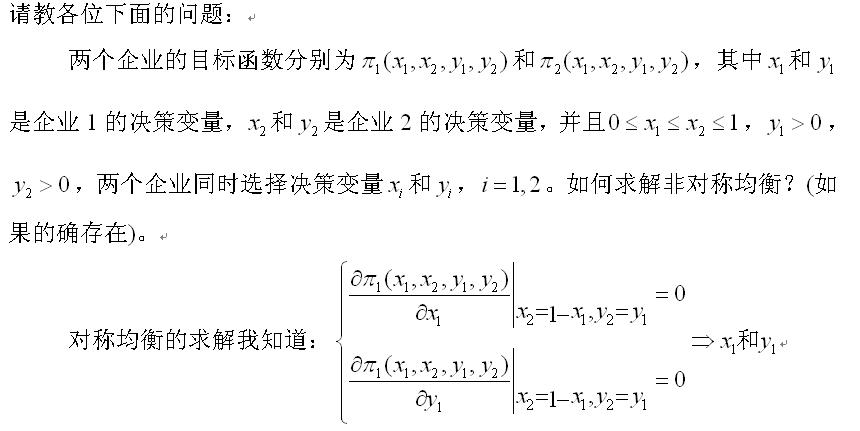为了各位理解的方便,说得具体点吧:其中xi表示企业i的研发水平,yi表示企业i的选址,对称解意味着x1=x2,y1=1-y2。而且两个企业的利润函数的确是对称的,我也感觉没有非对称解,但是我看的一篇文章作者说他可以证明存在非对称解,并且一个选择市场中点,一个选择市场端点。但是我验证这样的结果不是企业的最优选择,即企业有动机改变选址。所以我才提出这个问题,希望有人能够帮忙解决:如何求解这个非对称解?