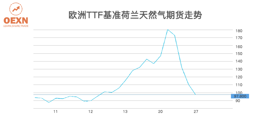 OEXN报道:当地时间周一,欧洲TTF基准荷兰天然气期货暴跌11%达97.60欧元/MWH,较此前高点180.27欧元/MWH高点相比,近乎腰斩。
