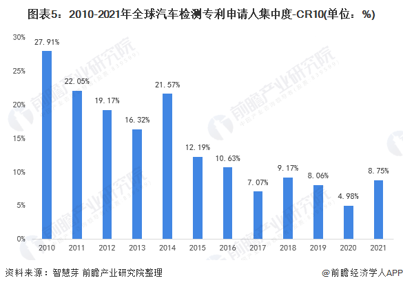 2010-2021年8月,全球汽车检测专利申请人CR10呈现波动下降趋势,由2010年的27.91%波动下降至2021年8月的8.75%。整体来看,全球汽车检测专利申请人集中度不高,且集中度呈现下降趋势。