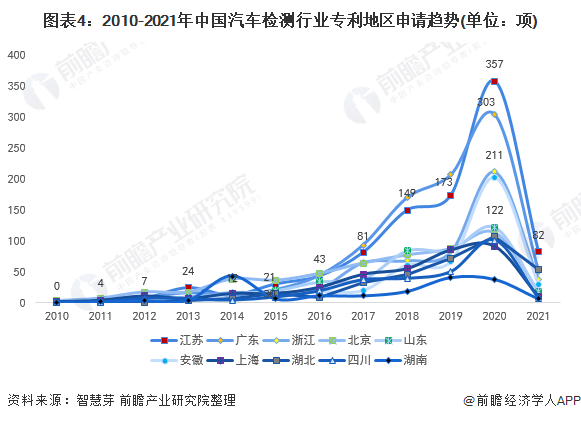 趋势方面,2010-2016年期间,广东和北京汽车检测专利申请量基本一致,然而自2018-2019年,广东逐渐拉开与北京的距离,并一直位居榜首。2020年,江苏的申请量超过广东,为357项,成为第一。安徽和浙江在2018-2020年的汽车检测专利申请量差距不大。