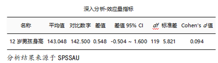 从上表可知,利用单样本_t_检验12岁男孩身高共1项是否明显的不等于数字142.5, 12岁男孩身高全部均不会表现出显著性(p>0.05),意味着12岁男孩身高共1项的平均值接近于数字142.5,没有统计意义上的差异性。