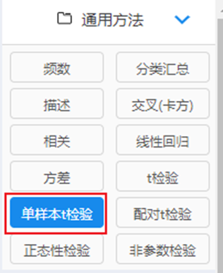 (1)点击SPSSAU通用方法里面的‘单样本t检验’按钮。如下图: