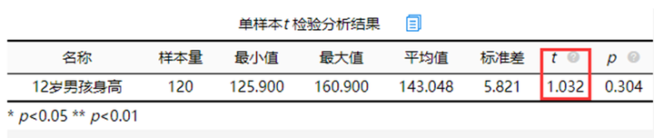 单样本_t_ 检验用于分析定量数据是否与某个数字有着显著的差异性,比如五级量表,3分代表中立态度,可以使用单样本_t_ 检验分析样本的态度是否明显不为中立状态;系统默认以0分进行对比。此案例分析某市12岁男孩身高与该地区12岁男孩平均身高有否差异?已知该地区12岁男孩平均身高为142.5cm。