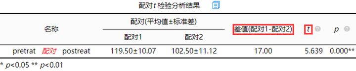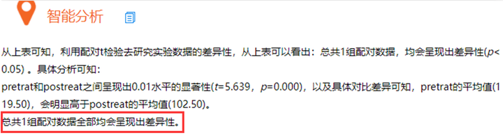 将数据放入分析框中,SPSSAU系统生成配对t检验的分析结果,如下: