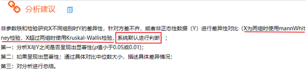 (1)如果X的组别为两组,比如上表中男和女共两组,则应该使用MannWhitney统计量,如果组别超过两组,则应该使用Kruskal-Wallis统计量结果。SPSSAU自动为你选择MannWhitney或者Kruskal-Wallis统计量。