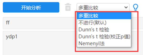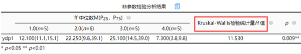 从上表可以看出:ff超过两组组成,因而使用Kruskal-Wallis检验统计量进行分析。不同ff样本对于ydp1全部均呈现出显著性(p<0.05),意味着不同ff样本对于ydp1均有着差异性。
