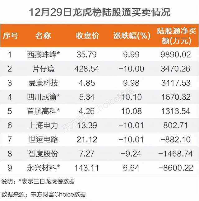 陆股通参与龙虎榜中个股共涉及9股,其中6股被陆股通净买入,西藏珠峰被买入最多,三日净买入9890.02万元。另外3股被陆股通净卖出,永兴材料被卖出最多,三日净卖出8600.22万元。